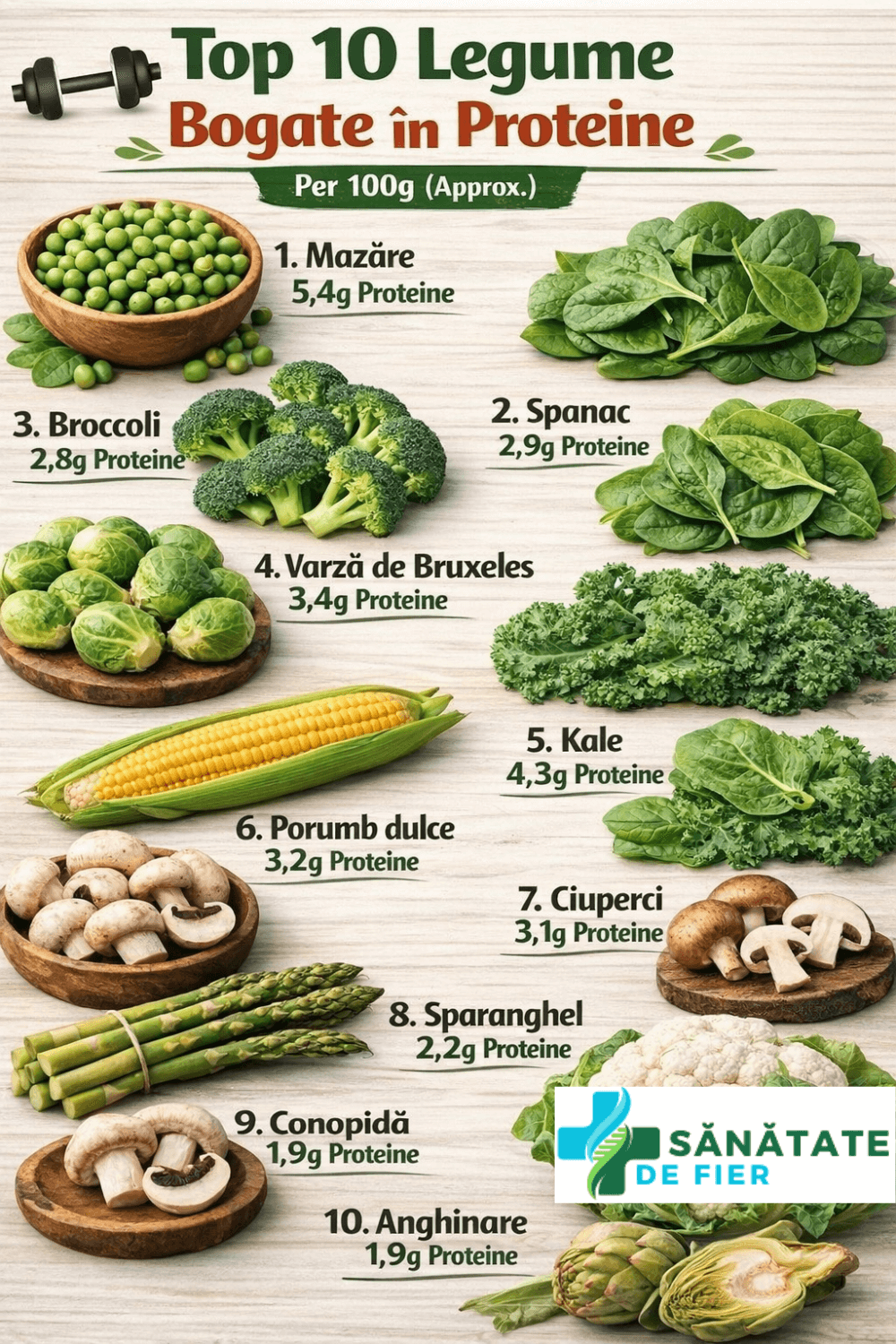 Broccoli este o alegere populara de legume bogate in proteine, deoarece contine, de asemenea, antioxidanti puternici si vitamine. O ceasca de broccoli tocat si gatit are putin sub 2 grame de proteine si ocupa locul inalt pe scorul de aminoacizi ca aliment proteic complet. ( 27 )